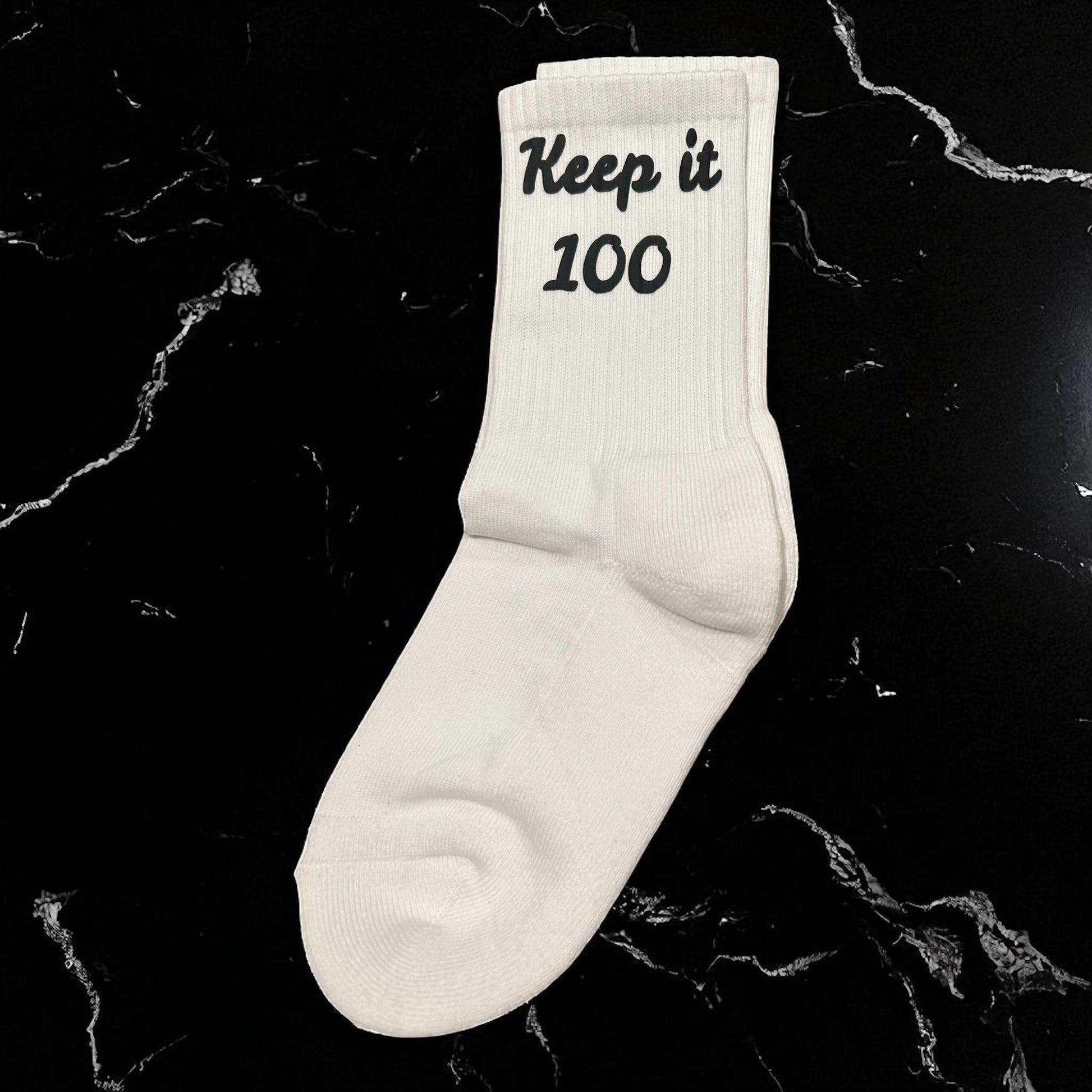 Step up your streetwear game with Keep It 100 Socks. Designed for all-day comfort and everyday flex, these socks bring the same bold energy as our clothing – minimal, stylish, and built to last. 90% cotton, 7% nylon, 3% elastane
